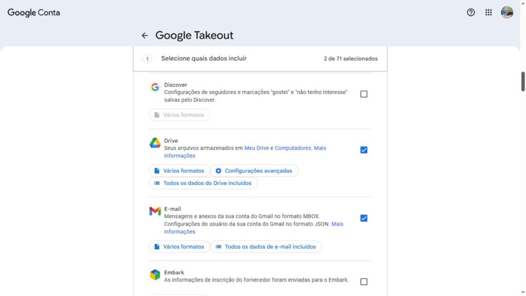 • Por padrão, todos os seus dados do Google estarão selecionados. Clique em “Desmarcar tudo” para começar do zero.